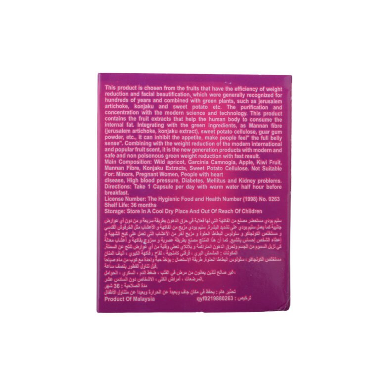 - كما أن تركيبته الفعالة الممزوجة بمكونات الفاكهة الطبيعية والأعشاب المعدلة تساعد على تخليص الجسم من السموم وتحمي من أي أعراض تنتج عن السمنة.